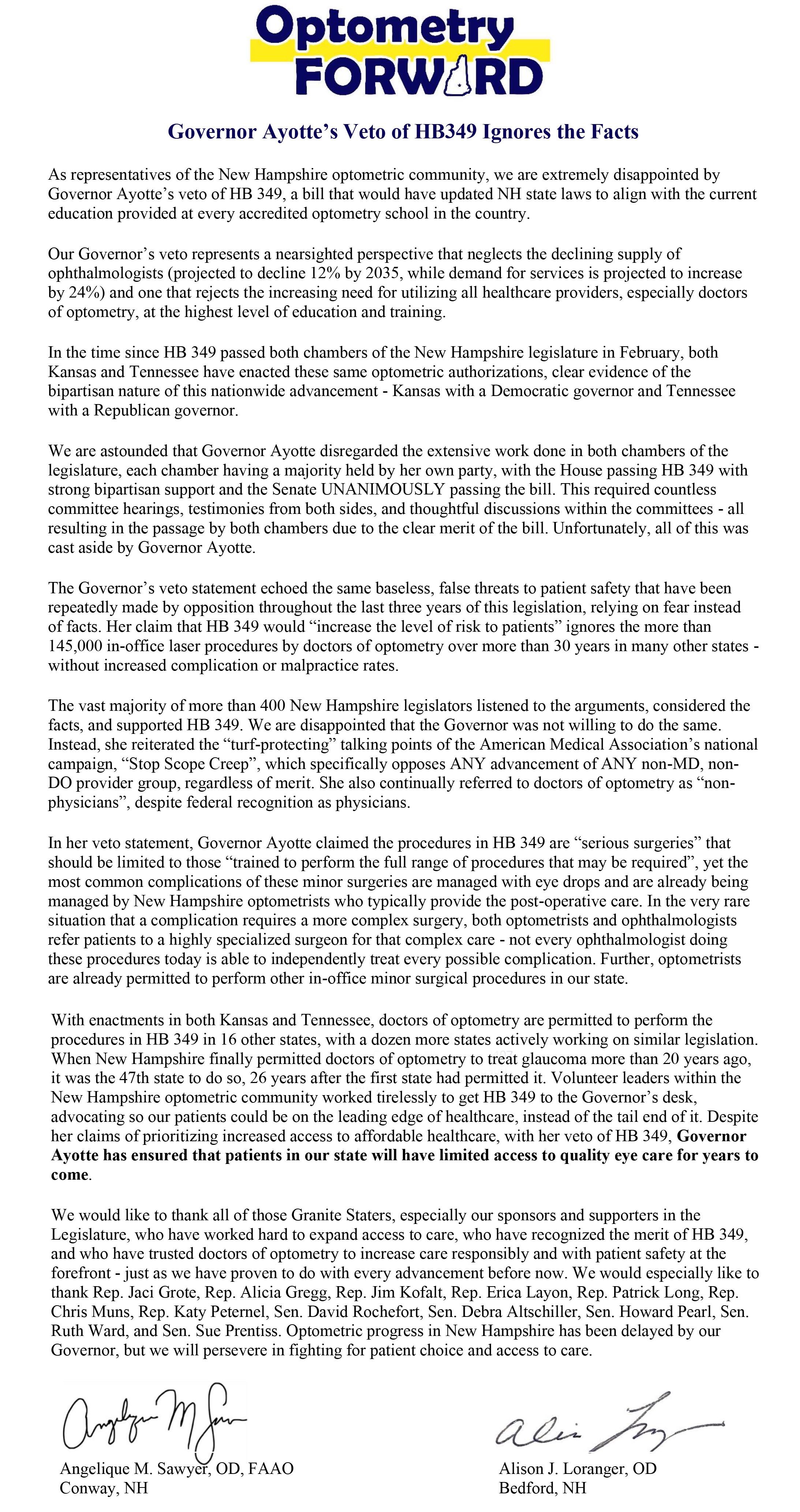 Hospital, as well as a recent University of New Hampshire survey, as reasons for opposing HB 349. As an optometrist practicing in North Conway and Berlin since 2013, this partnership is a welcome addition, but it does not negate the need for HB 349 nor solve many of the challenges associated with providing eye care services in our area or across the state.