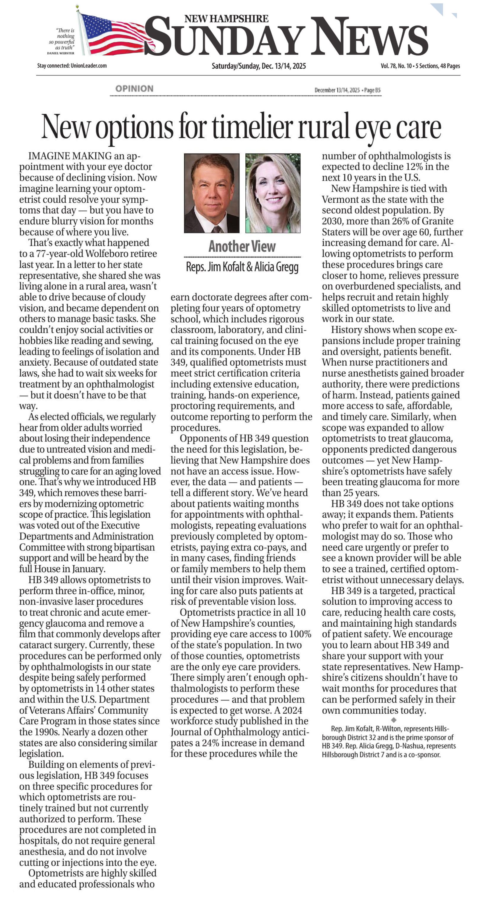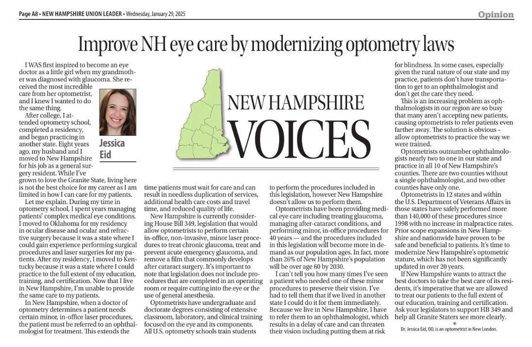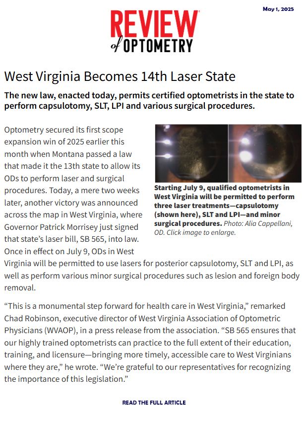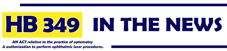HB 349 allows three common non-invasive, in-office laser procedures to treat chronic glaucoma, treat and prevent acute emergency glaucoma, and remove a film that commonly develops after cataract surgery. It does not include procedures that require cutting into the eye, are completed in an operating room or require the use of general anesthesia. Legislation also authorizes the Board of Optometry to develop rules that must include live patient experience regarding certification of optometrists to perform these procedures.